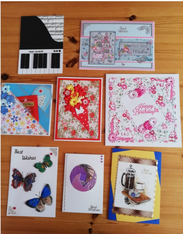 The group makes greeting cards using a variety of techniques. Most of the materials are provided, along with equipment and methods demonstrated. Sessions are led by different group members and beginners are given help.